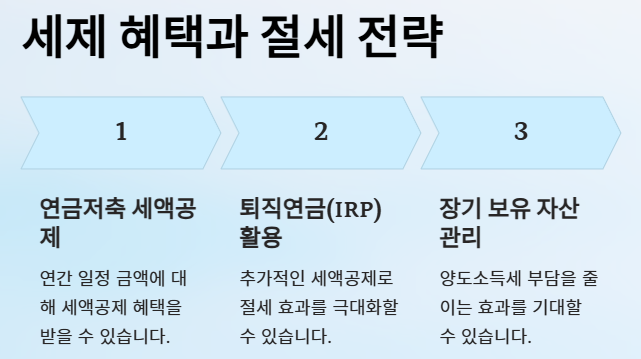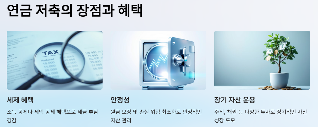연금 저축은 노후 자금 마련을 위한 다양한 혜택을 제공합니다. 가장 큰 장점은 세제 혜택으로, 매년 일정 금액에 대해 소득 공제나 세액 공제가 가능하여 세금 부담을 줄일 수 있습니다. 이는 적립 초기부터 비용 효율적으로 자산을 축적할 수 있는 기반을 마련해 줍니다.