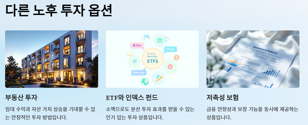 연금 외에도 노후 자금을 준비하는 데 유용한 다양한 금융 상품이 존재합니다. 주식, 채권, 펀드와 같은 전통적인 투자 상품 외에도 부동산 투자나 ETF 같은 간접 투자 옵션을 활용할 수 있습니다.