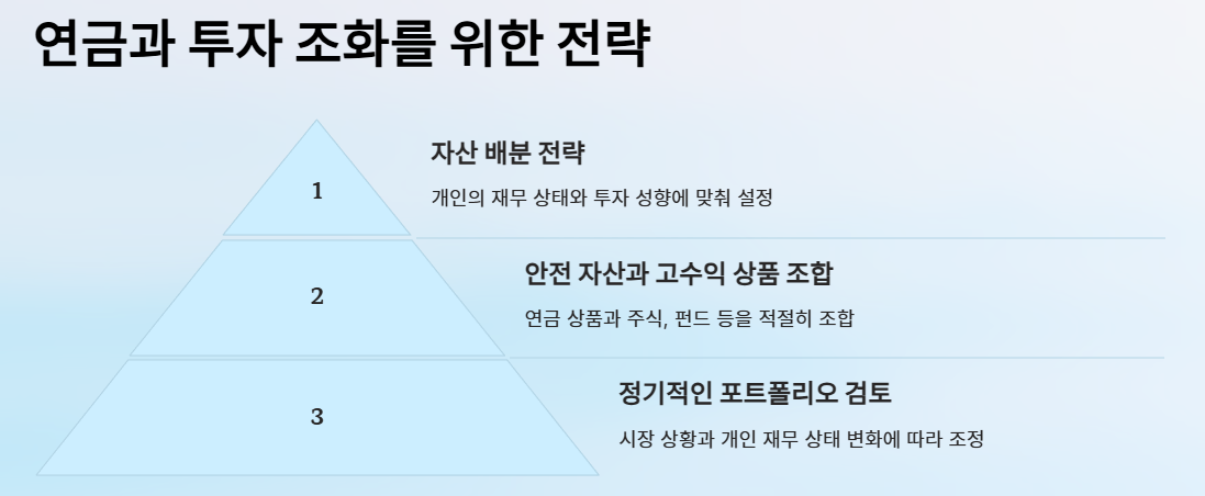 연금과 다양한 투자 상품을 조화롭게 활용하면 장기적인 안정성과 수익성을 모두 추구할 수 있습니다. 이를 위해 가장 중요한 것은 자산 배분 전략입니다. 자산 배분은 개인의 재무 상태, 투자 성향, 노후 목표 등에 따라 유연하게 설정해야 합니다.