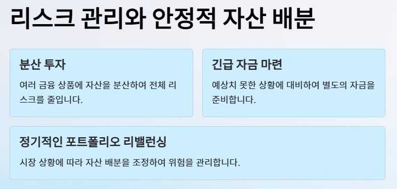 분산 투자는 리스크를 줄이는 가장 효과적인 방법 중 하나입니다. 여러 금융 상품에 자산을 분산하면 한 가지 투자에서 손실이 발생하더라도 전체 자산에 미치는 영향을 최소화할 수 있습니다. 예컨대, 연금, 주식, 채권, 부동산 등에 자산을 나누어 투자하면 안정성과 수익성을 동시에 추구할 수 있습니다.